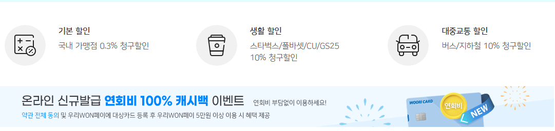 - 온라인을 통해 기간 내 K-패스 우리카드(신용)를 소지한 회원이 2025년 5월 31일까지 대중교통 이용금액을 제외한 국내가맹점 30만원 이상 사용 시 CU 모바일 상품권 5천원권 3매 증정