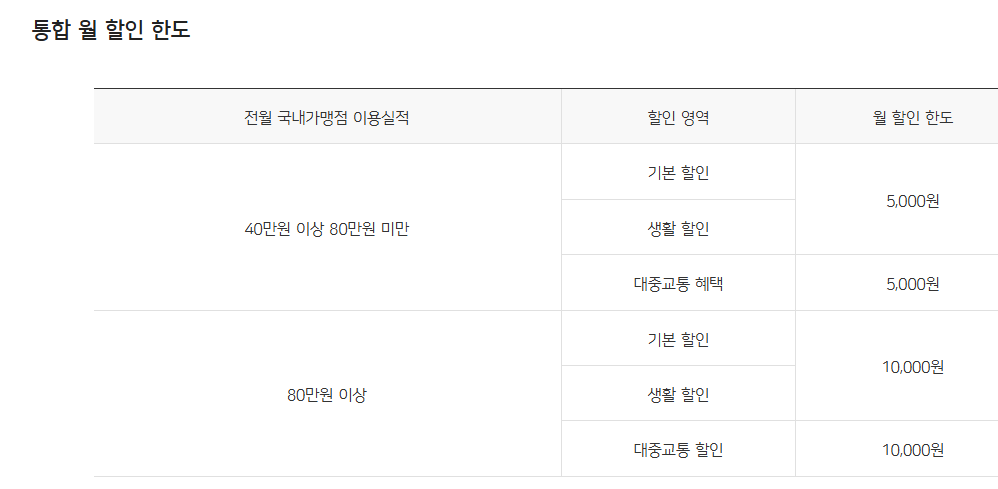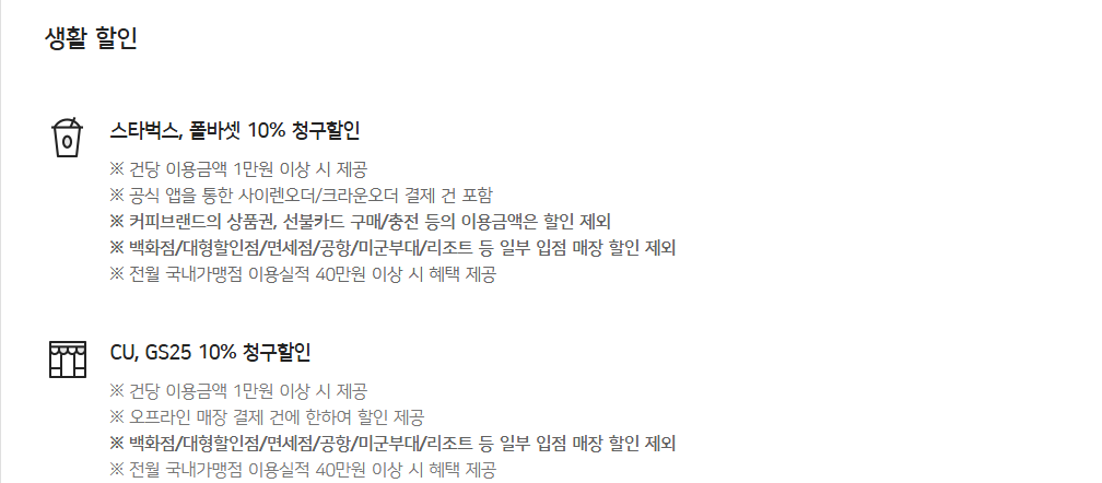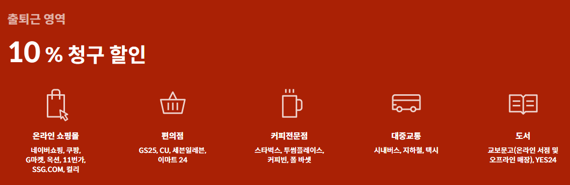- 10% 청구 할인 ① 온라인쇼핑몰 ② 편의점 ③ 커피전문점 ④ 대중교통 ⑤ 도서
