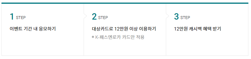 - 혜택 : 행사 기간 내 응모 후 대상카드로 12만원 이용 시 12만원 캐시백
